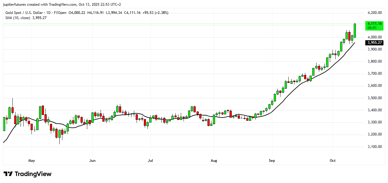 Gold (XAUUSD) and Gold Futures have closed at a new record high today. Gold gave a buy signal on 22August 2025 at $3356 and has not given a sell signal till today, 13 Oct 2025 at $4111.